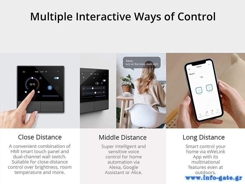 Συνδέεται μέσω Wi-Fi και της εφαρμογής eWeLink με το smartphone σας επιτρέποντας σας να ελέγχετε απομακρυσμένα τις συσκευές σας και υποστηρίζει φωνητικό έλεγχο μέσω Amazon Alexa ή Google Assistant.
