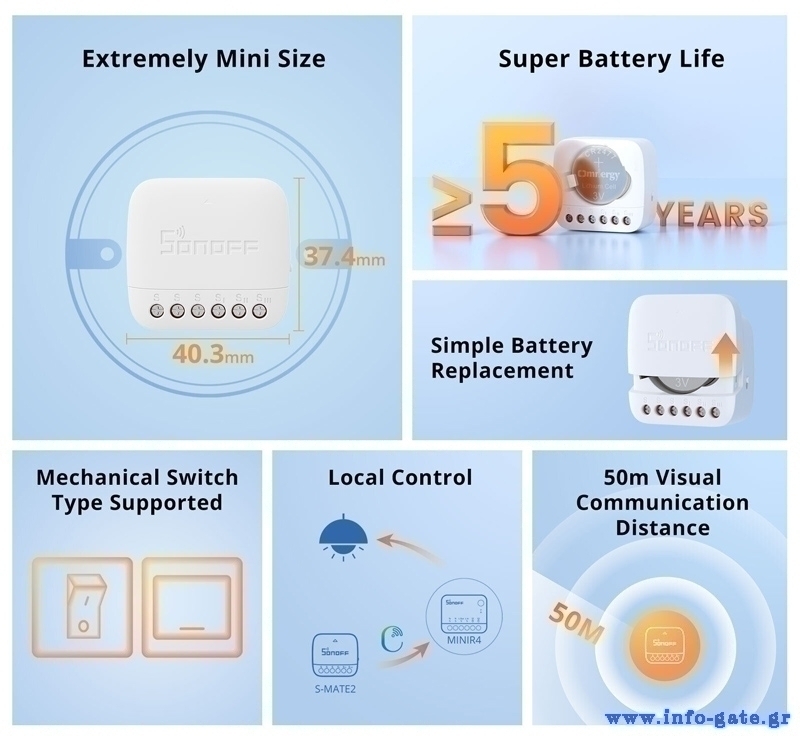 Η τοποθέτηση του γίνεται στο κυτίο ενός συμβατικού διακόπτη 1/2/3 καναλιών ενώ η τροφοδοσία του γίνεται με μπαταρία CR2477.