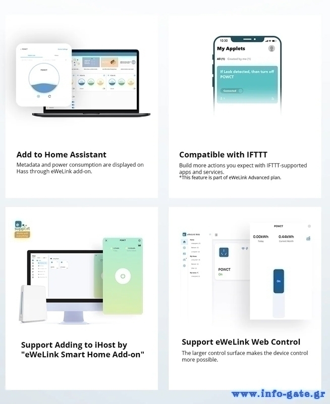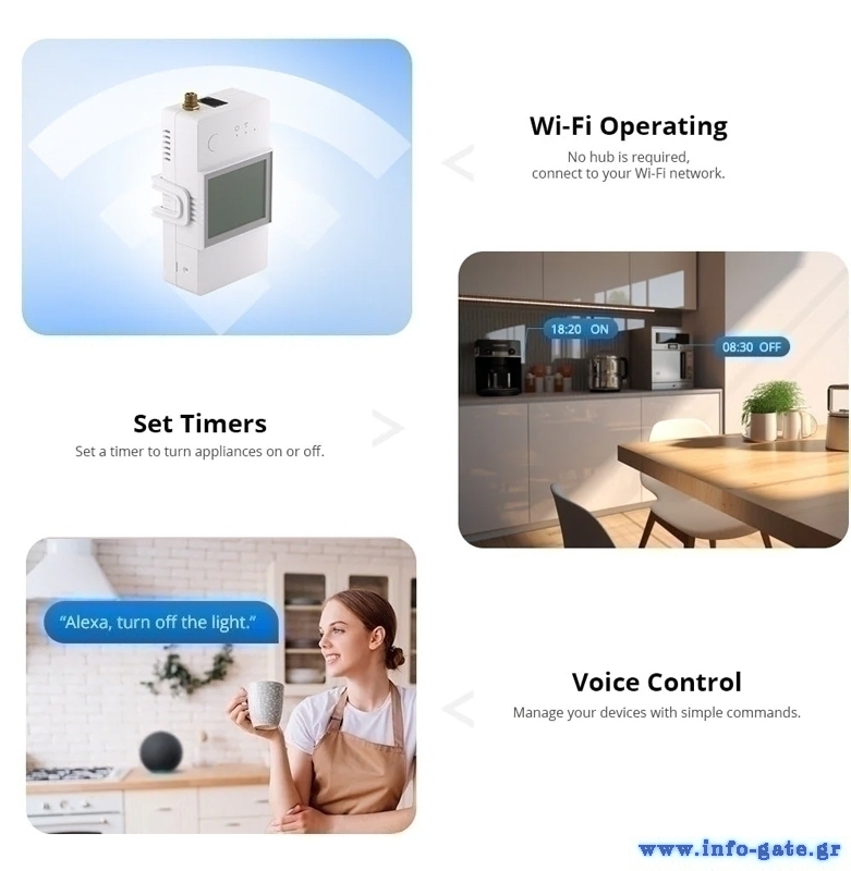 Συνδέεται μέσω WiFi και της εφαρμογής eWeLink με το smartphone σας, επιτρέποντας σας να παρακολουθείτε το ρεύμα που καταναλώνουν οι συσκευές σας και να υπολογίσετε το κόστος λειτουργίας τους. Μπορείτε να παρακολουθείτε την ακριβή τάση και ισχύ σε πραγματικό χρόνο, να προγραμματίσετε την αυτόματη ενεργοποίηση και απενεργοποίηση των συσκευών σας σε καθορισμένο χρόνο, άλλα και να ορίσετε τιμές κατώτατου ορίου για το ρεύμα, την τάση και την ισχύ ώστε να προστατεύσετε τις συσκευές σας από την υπερφόρτωση.