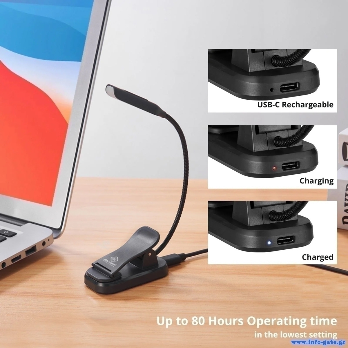 Ο εύκαμπτος βραχίονας σας επιτρέπει να ρυθμίζετε τη γωνία φωτισμού όπως επιθυμείτε, ενώ το πρακτικό κλιπ στερέωσης εξασφαλίζει σταθερό κράτημα στο βιβλίο.