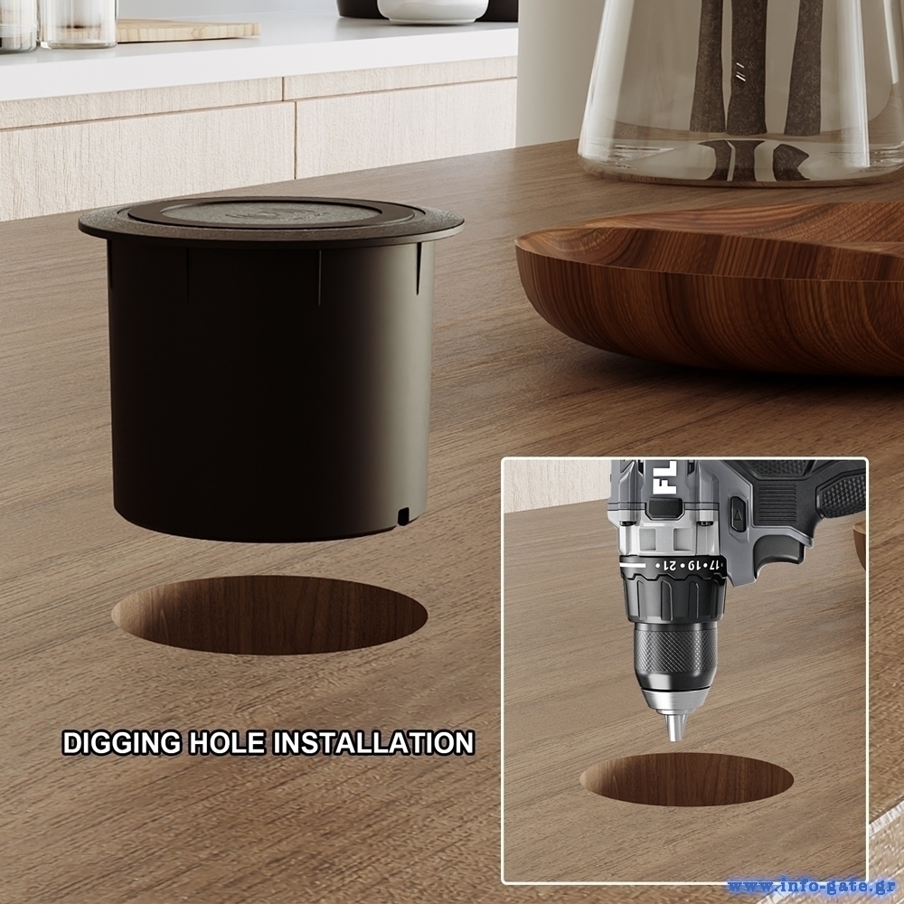 Η τοποθέτηση του γίνεται σε γραφείο, πάγκο ή ακόμη και σε επιφάνεια σκαφών και οχημάτων όπως τροχόσπιτα κ.α. που διαθέτουν οπή με διάμετρο 60mm.