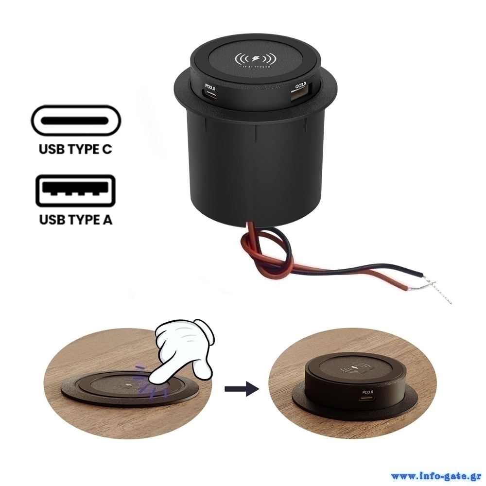 Υποστηρίζει ασύρματη φόρτιση με απόδοση έως 15W. Επιπλέον, εξοπλίζεται με USB και USB-C θύρες που υποστηρίζουν φόρτιση με απόδοση έως 30W και εμφανίζονται με pop up μηχανισμό, πιέζοντας την επιφάνεια του φορτιστή προς τα κάτω.