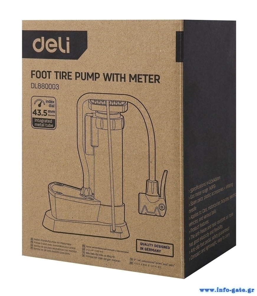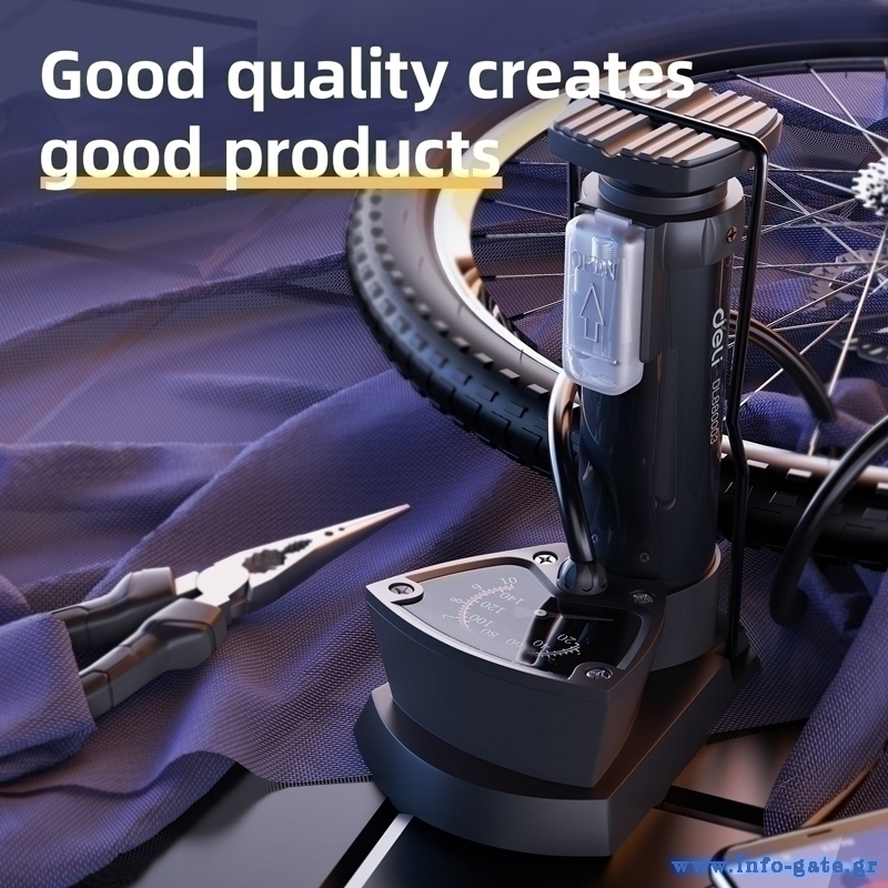 Τρόμπα ποδιού της Deli ιδανική για το φούσκωμα ελαστικών αυτοκινήτου/μοτοσυκλετών/ποδηλάτων, μπάλες ή άλλων φουσκωτών ειδών. Διαθέτει μανόμετρο για ακριβή έλεγχο της πίεσης και ανθεκτική κατασκευή με άνετο πετάλι για σταθερή χρήση.