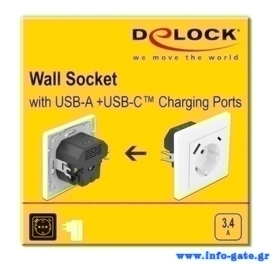 DELOCK πρίζα τοίχου 11489 με θύρες φόρτισης USB & USB Type-C 3.4A, λευκή