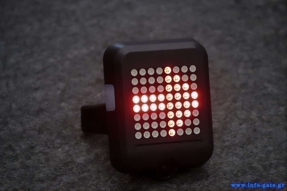 Οπίσθιος φωτισμός ποδηλάτου BIKE-0034 που τοποθετείται εύκολα και με ασφάλεια στο πίσω μέρος του ποδηλάτου. Η συσκευή έχει επαναφορτιζόμενη μπαταρία 1200 mAh η οποία φορτίζεται μέσω θύρας USB. Τα 64 LED παρέχουν εξαιρετικό φωτισμό κάνοντας το ποδήλατο ορατό την νύχτα αλλά και την ημέρα. Τα led είναι παραμετροποιήσιμα και μπορούν να παράγουν διαφορετικά σχέδια. Οι έξυπνη λειτουργία ανάβει αυτόματα το φως στην μέγιστη φωτεινότητα μόλις το ποδήλατο φρενάρει, ενώ αν ο ποδηλάτης γύρει 10 μοίρες προς τα δεξιά ή αριστερά παράγεται βέλος σήμανσης στην ανάλογη κατεύθυνση για να προειδοποιεί τους διερχόμενους οδηγούς. Στο πίσω μέρος της συσκευής υπάρχει ειδικό laser το οποίο μπορεί να ενεργοποιηθεί και να ειδοποιεί με σήμανση πάνω στον δρόμο ότι προπορεύεται ποδήλατο. Η συσκευή είναι κατασκευασμένη από ανθεκτικό υλικό και είναι αδιάβροχη.