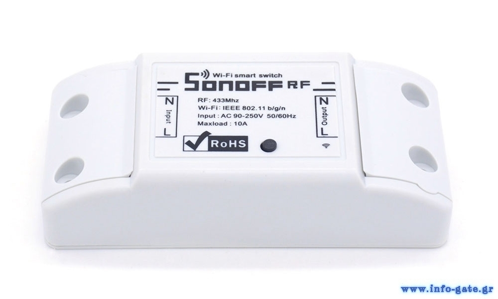 Το Sonoff RF είναι μια οικονομική συσκευή χαμηλού κόστους, που σας βοηθά να μετατρέψετε το σπίτι σας σε "έξυπνο σπίτι". Είναι ένας WiFi ασύρματος διακόπτης που μπορεί να συνδεθεί σε οικιακές συσκευές διαφορετικών τύπων και κατασκευαστών. Το Sonoff στέλνει στοιχεία σε cloud πλατφόρμα μέσα από το WiFi Router και σας επιτρέπει να ελέγχετε από μακριά όλες τις οικιακές συσκευές σας με την εφαρμογή eWeLink από το smartphone σας. Το Sonoff κάνει όλες τις οικιακές συσκευές σας έξυπνες, και όσο το τηλέφωνό σας είναι συνδεδεμένο στο δίκτυο μπορείτε να ελέγξετε από οπουδήποτε τις οικιακές συσκευές σας. θέτοντας χρονικά όρια για τις οικιακές συσκευές σας, μπορείτε να έχετε περισσότερο ελεύθερο χρόνο. Συνεργάζεται με το RF remote controller (δεν συμπεριλαμβάνεται στη συσκευασία), που σας επιτρέπει να έχετε έλεγχο στις οικιακές συσκευές σας.