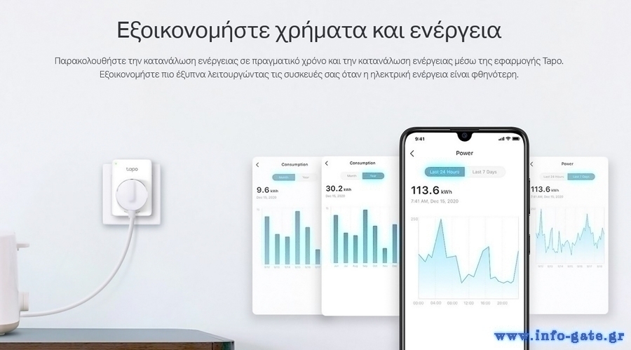 Smart αντάπτορας ρεύματος της TP-Link, με τον οποίο μπορείτε να ελέγξετε την λειτουργία on/off των συσκευών σας, μέσω της εφαρμογής Tapo και να παρακολουθήσετε την κατανάλωση ενέργειας σε πραγματικό χρόνο ή μέσω της εφαρμογής Tapo.