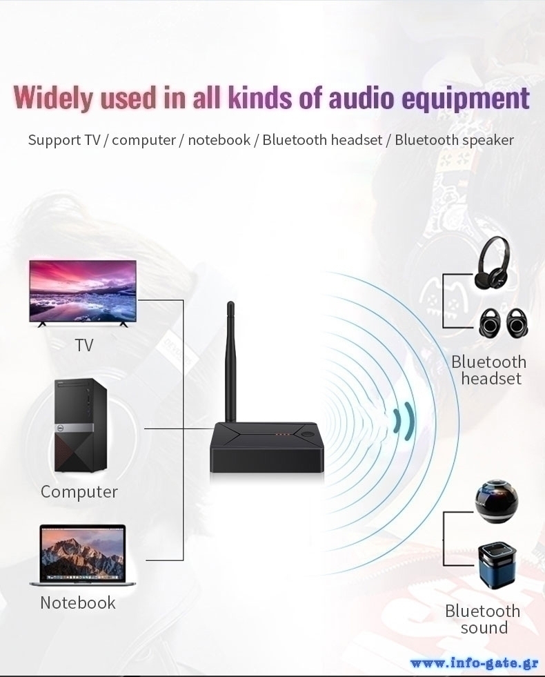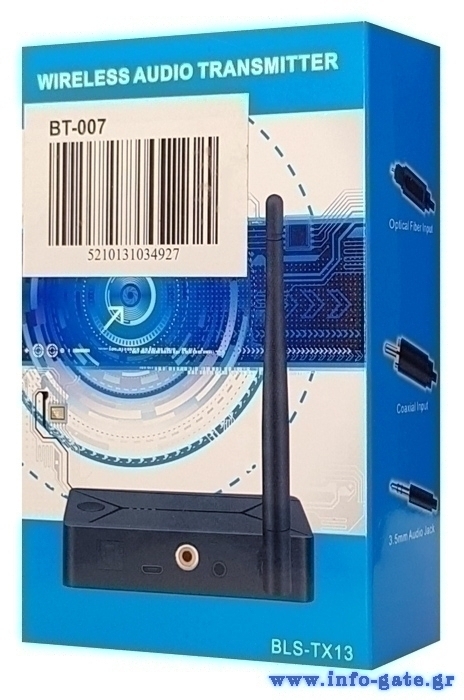 Ασύρματη μετάδοση μουσικής μέσω Bluetooth 5.0 από το smartphone, tablet, τηλεόραση ή τον υπολογιστή σας σε οποιοδήποτε στερεοφωνικό σύστημα, απλό ηχείο ή ασύρματα ακουστικά μέσω Bluetooth. To BT-007 μετατρέπει οποιαδήποτε συσκευή με τροφοδοσία 3.5mm, RCA και Toslink σε ασύρματη.