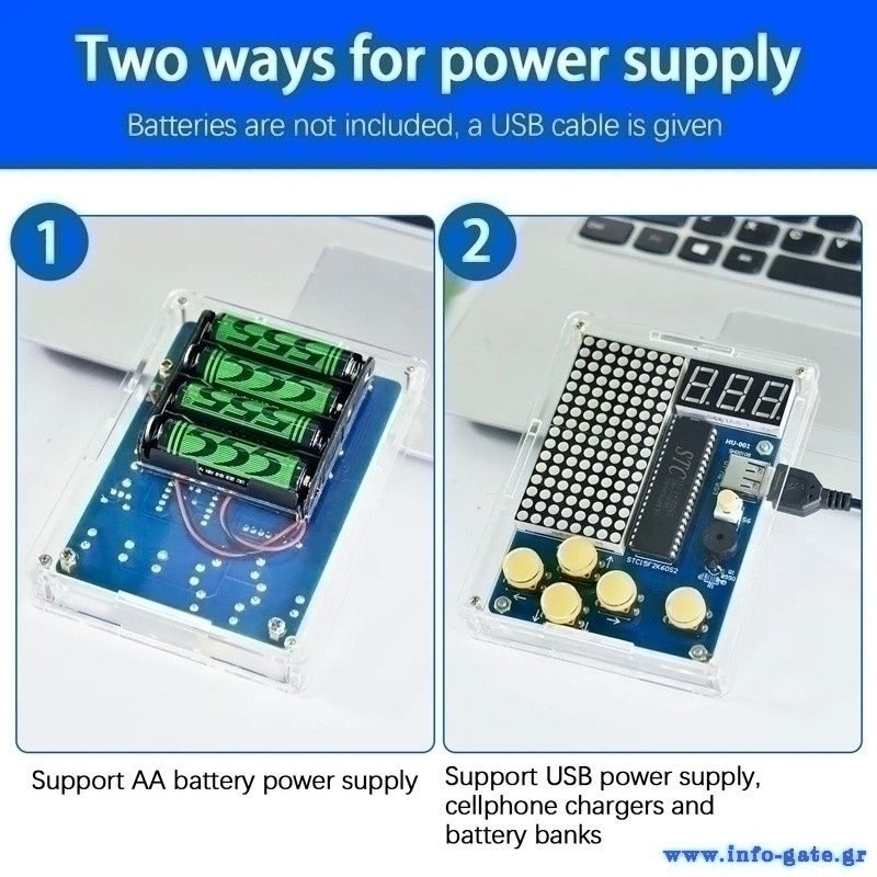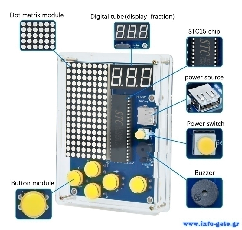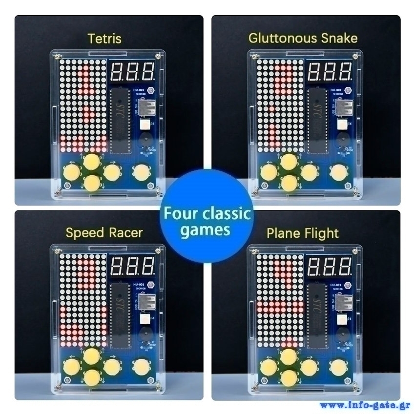 51 microcontroller Game Boy παιχνιδομηχανή της Keyestudio για Arduino. Διαθέτει 4 κλασσικά παιχνίδια (Tetris, Gluttonous snake, Speed racer, Plane flight). Τροφοδοτείται με 4 AA μπαταρίες (δεν συμπεριλαμβάνονται) ή με καλώδιο USB (συμπεριλαμβάνεται)