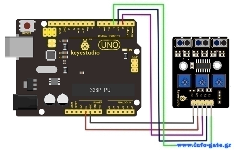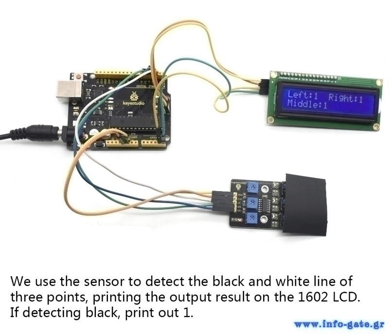 3-channel infrared line tracking sensor της Keyestudio. Μπορεί να κανει ένα Arduino DIY smart car να ακολουθεί μια γραμμή.
