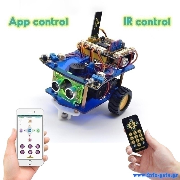 Το kit desktop mini bluetooth smart car V3.0 σας δίνει την δυνατότητα να κατασκευάσετε το δικό σας smart car ρομπότ μέσω της ολοκλήρωσης πολλών δημιουργικών projects και να μάθετε να το ελέγχετε με mixly blocks coding. Διαθέτει λειτουργίες όπως line tracking, αποφυγή εμποδίων, cross maze, ultrasonic following, gravity sensing, φωνητικό έλεγχο, έλεγχο από ασύρματο χειριστήριο IR και smartphone μέσω Bluetooth. Επιπλέον συμπεριλαμβάνει μονάδα ήχου μικρόφωνου που επιτρέπει την αναπαραγωγή μουσικής ή άλλων ήχων κατά την διάρκεια της οδήγησης του smart car. Ο έλεγχος από smartphone γίνεται μέσω της εφαρμογής Dekstop Car για Android και της εφαρμογής Keyes BT Car για iOS. Η τροφοδοσία του ρομπότ μπορεί να γίνει με 2x μπαταρίες 18650 ή 4x μπαταρίες AA 1,5V (δεν συμπεριλαμβάνονται).