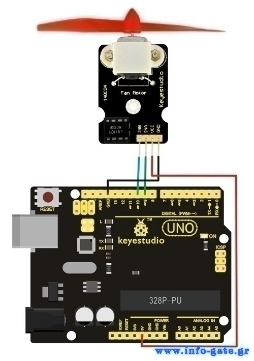 L9110 fan module της Keyestudio. Mπορεί εύκολα να σβήσει τη φλόγα ενός φωτός σε απόσταση 20 εκατοστών, γεγονός που το καθιστά ένα ουσιαστικό κομμάτι στην ανάπτυξη ρομπότ κατά της πυρκαγιάς.
