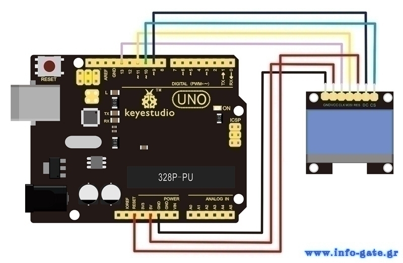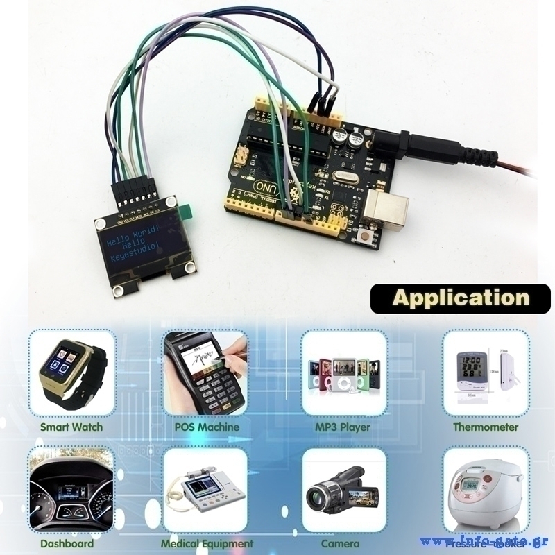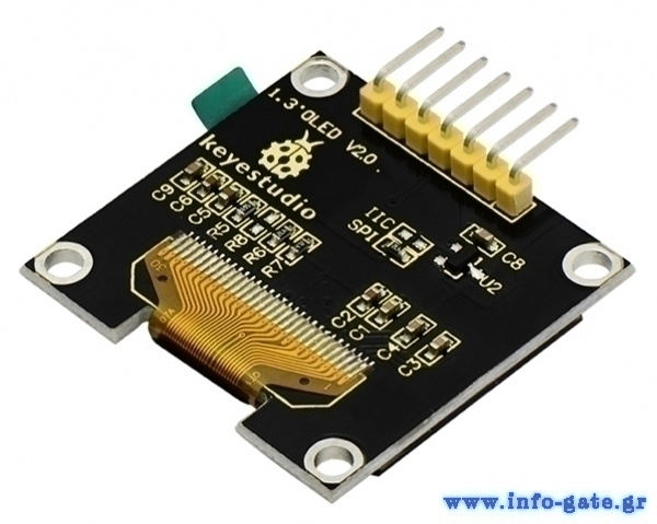 OLED graphic display module της Keyestudio. Είναι μια οθόνη με τεχνολογία OLED που χρησιμοποιεί μόνο ηλεκτρική ενέργεια ανά pixel γεγονός που την καθιστά πολύ αποτελεσματική. Συμβατή με Arduino UNO R3.