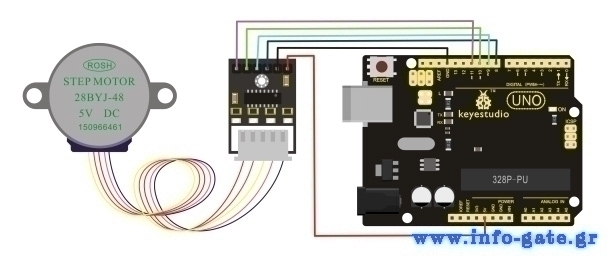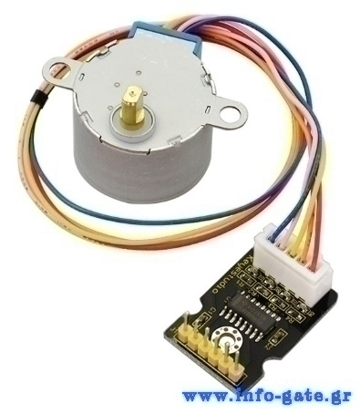Stepper motor drive board και stepper motor της Keyestudio. Μπορεί να μετατρέψει τους ηλεκτρικούς παλμούς σε διακριτές μηχανικές κινήσεις.