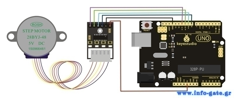 Stepper motor driver module και stepper motor της Keyestudio. Μπορεί να μετατρέψει τους ηλεκτρικούς παλμούς σε διακριτές μηχανικές κινήσεις.