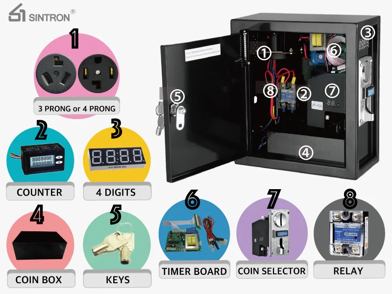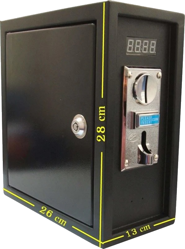 * Περιλαμβάνει τον κερματοδέκτη και την πλακέτα χρονοχρέωσης που ελέγχει την τροφοδοσία με ρελέ 220V, τροφοδοτικό 12V, κυτίο συλλογής κερμάτων με κλειδαριά και 2 αντικλείδια.