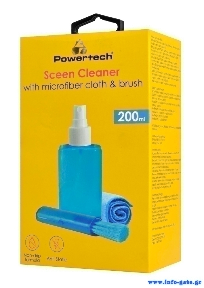 POWERTECH σπρέι καθαρισμού οθόνης PT-1313 με πανί μικροϊνών & βουρτσάκι, 200ml