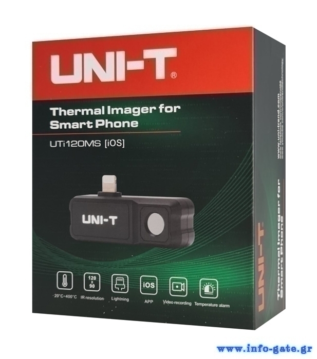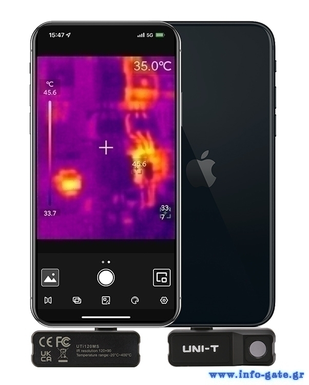 Το UTi120MS είναι μια μικρή σε μέγεθος, επαγγελματική συσκευή θερμικής απεικόνισης, η οποία συνδέεται με iPhone μέσω της θύρας Lightning.