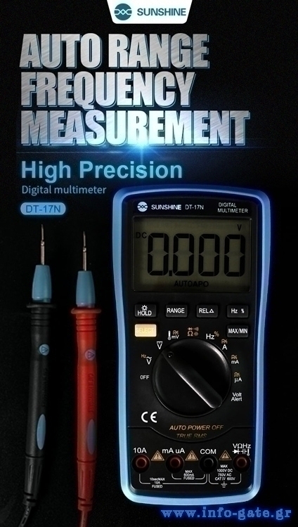 Το αυτόματο ψηφιακό πολύμετρο μπαταρίας DT-17N από την Sunshine παρέχει μετρήσεις υψηλής ακρίβειας. Είναι κατάλληλο για επισκευές ηλεκτρικού εξοπλισμού και συσκευών, εργασίες οικιακής καλωδίωσης κ.α.