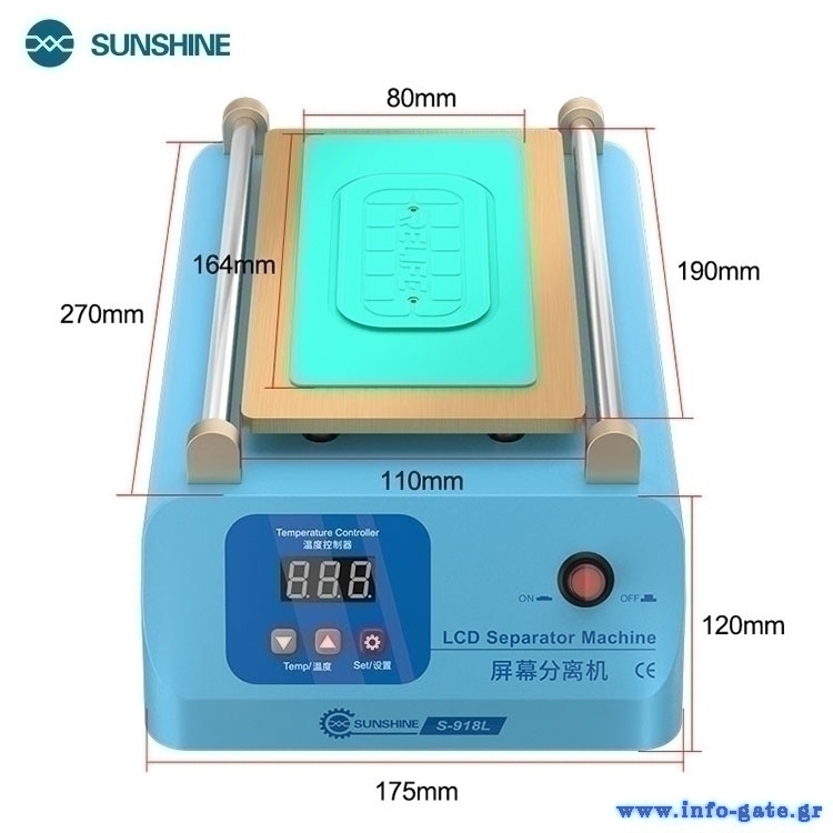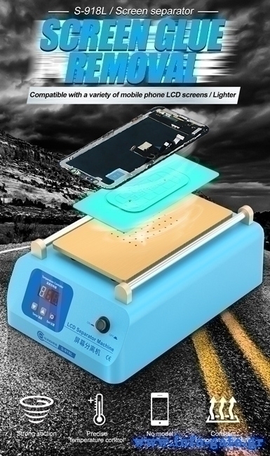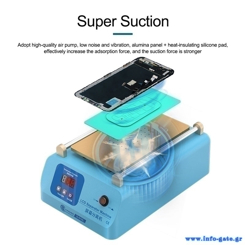 Μηχάνημα διαχωρισμού LCD οθόνης smartphone από την Sunshine. Διαθέτει θερμοστάτη για την ρύθμιση της θερμοκρασίας και οθόνη για την παρακολούθηση της σε πραγματικό χρόνο. Υιοθετεί την τεχνική του κενού αέρα, μέσω της αντλίας που έχει, κάτι το οποίο κάνει πιο εύκολη την χρήση του καθότι δεν χρησιμοποιεί σφιγκτήρες για την σταθεροποίηση της οθόνης και την αφαίρεση της.