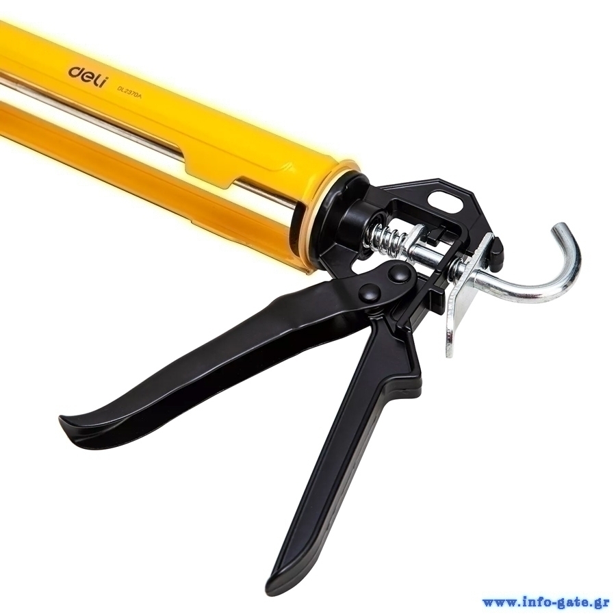 Πιστόλι σιλικόνης Deli ανοικτού τύπου, ιδανικό για φυσίγγια σιλικόνης μήκους έως 250mm. Είναι κατασκευασμένο από ατσάλι και αλουμίνιο υψηλής ποιότητας και διαθέτει εργονομική λαβή.