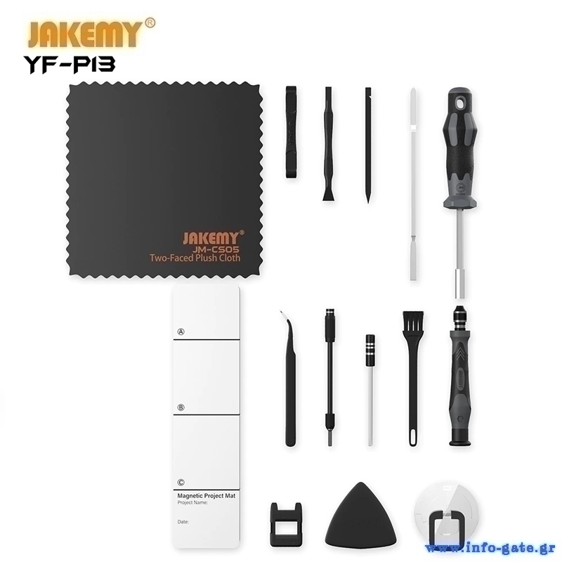 Σετ εργαλείων από την Jakemy που αποτελείται από κατσαβίδια, προεκτάσεις, μαγνητιστή, τσιμπίδα, εργαλεία ανοίγματος, βεντούζα διαχωρισμού, μύτες κατσαβιδιού κ.α.