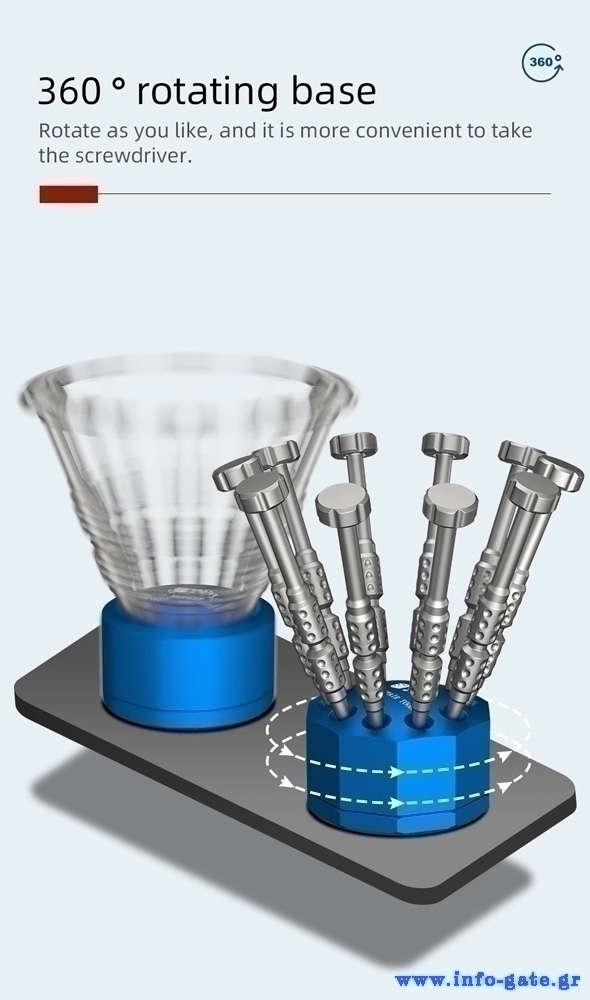 Η βάση είναι περιστρεφόμενη για άμεση πρόσβαση σε όλα τα κατσαβίδια.