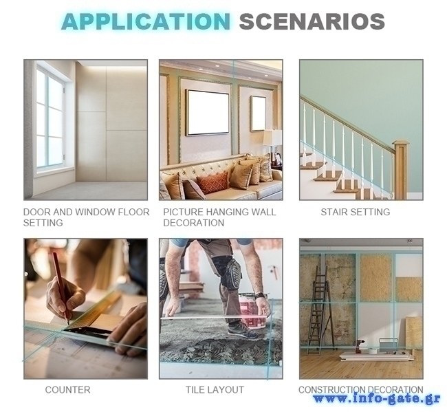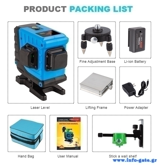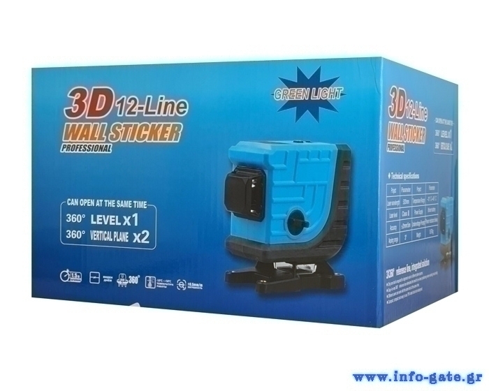 Αυτορυθμιζόμενο γραμμικό αλφάδι laser NF-112G με πράσινη δέσμη 12 ακτίνων 3D. Η εφαρμογή του είναι κατάλληλη για κατασκευή κτιρίων, διακόσμηση σπιτιών, ανακαίνιση, τοποθέτηση επίπλων, δάπεδα και διάταξη έργου.