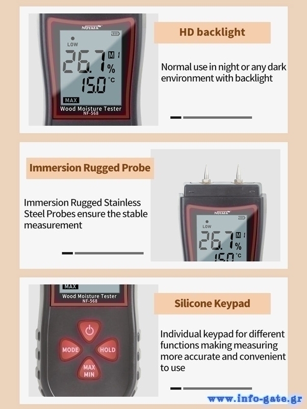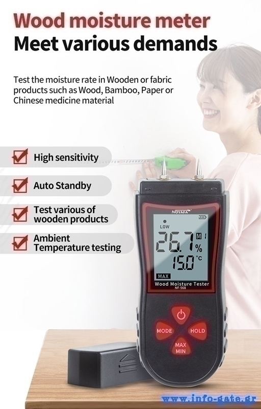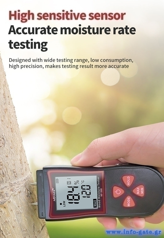 Το NF-568 είναι ένα εξαιρετικό εργαλείο για τη μέτρηση της περιεκτικότητας υγρασίας σε ξύλο, χαρτί, bamboo και άλλα υλικά από ξύλο.