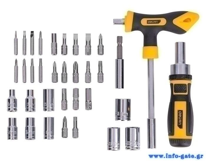 Σετ κατσαβιδιών ακριβείας της Deli το οποίο αποτελείται από 1 κατσαβίδι, 1 κλειδί τύπου Ταφ, 2 αντάπτορες και 31 διαφορετικές κεφαλές και εξαρτήματα κατσαβιδιού. Είναι τοποθετημένα μέσα σε πλαστική θήκη, για την εύκολη τακτοποίηση και μεταφορά τους.