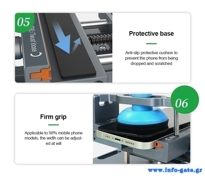 Ο διαχωρισμός της οθόνης γίνεται εύκολα με ισχυρή βεντούζα, χωρίς την χρήση θερμότητας. Η βάση τοποθέτησης του smartphone εξοπλίζεται με αντιολισθητικά pads που αποτρέπουν τις φθορές, ενώ διαθέτει και ειδική σχεδίαση για την προστασία της κάμερας. Το μήκος τοποθέτησης είναι ρυθμιζόμενο επιτρέποντας την τοποθέτηση smartphone διαφόρων μεγεθών.