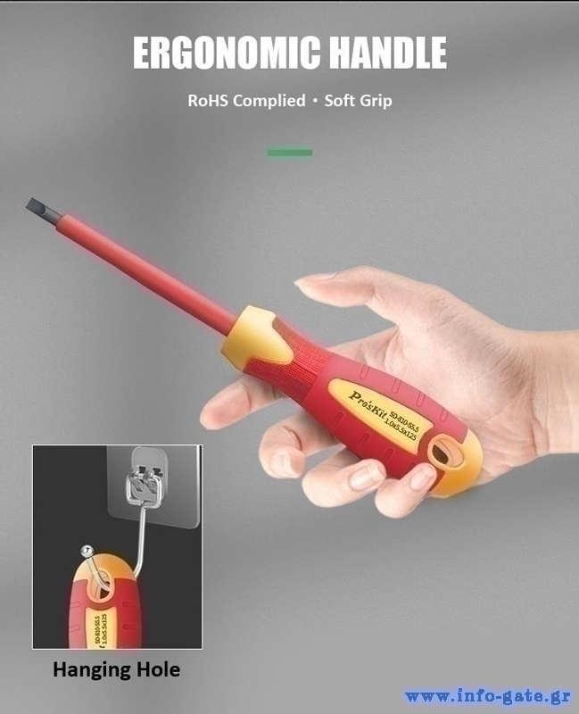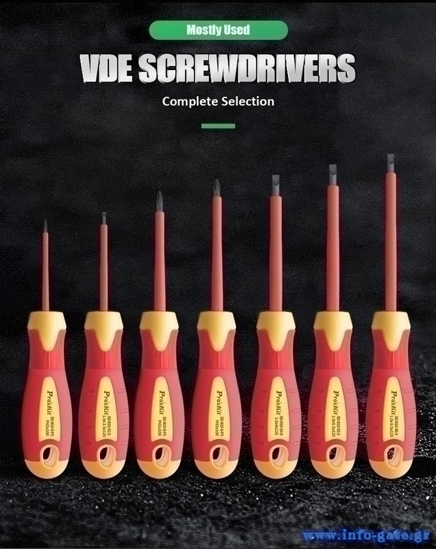 Σετ εργαλείων ηλεκτρολόγου της PROSKIT το οποίο αποτελείται από 7 κατσαβίδια (με μαγνητική μύτη), 2 μυτοτσίμπιδα, 1 πένσα και 1 πλαγιοκόφτη με μόνωση 1000V.
