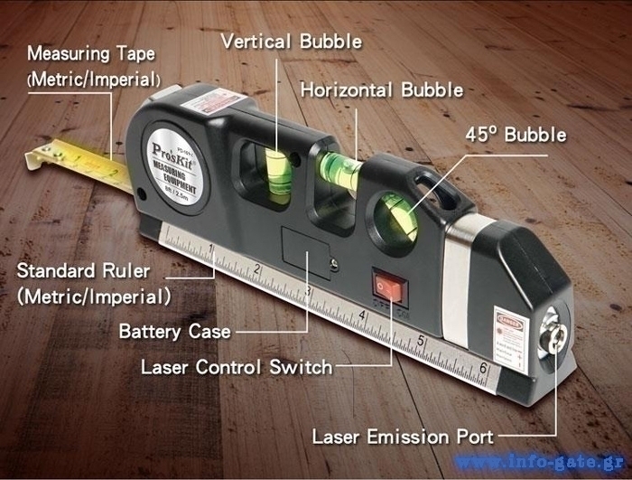 Πολυλειτουργικό αλφάδι της PROSKIT με laser κόκκινης δέσμης, 3 μάτια, 250cm μετροταινία και 15cm χάρακα.