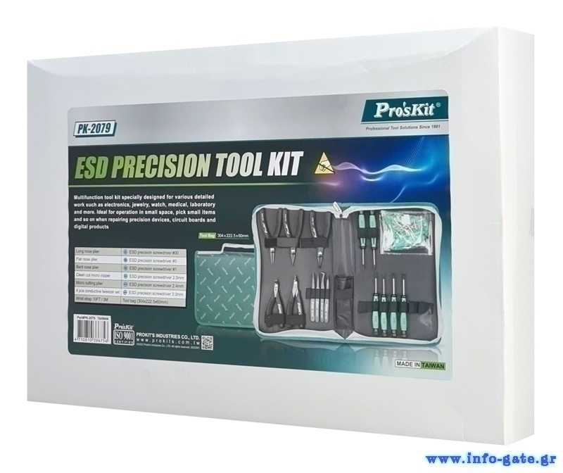 Σετ εργαλείων της PROSKIT το οποίο αποτελείται από 2x μυτοτσίμπιδα, 2x πλαγιοκόφτες, πλατυτσίμπιδο, 6x κατσαβίδια, 4x τσιμπίδες και ηλεκτροστατικό βραχιόλι.