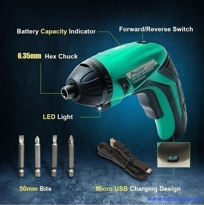 PROSKIT ηλεκτρικό κατσαβίδι PT-1362U με 4 μύτες, LED φακός, 1500mAh