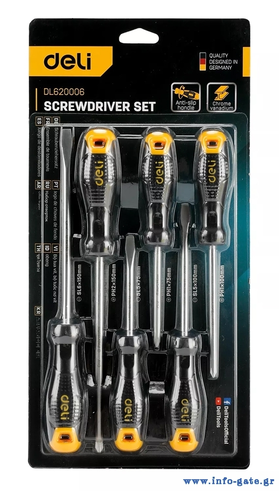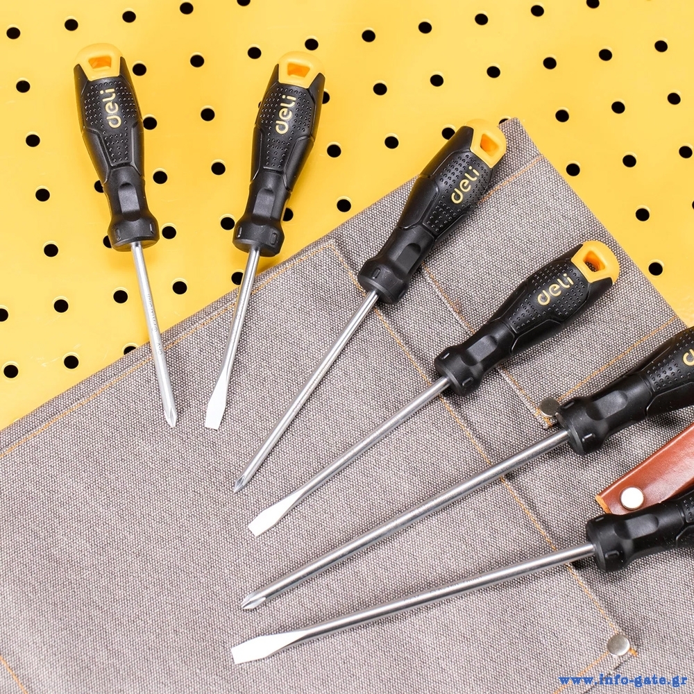 Σετ κατσαβιδιών της Deli που αποτελείται από 3 ίσια κατσαβίδια και 3 σταυρωτά.