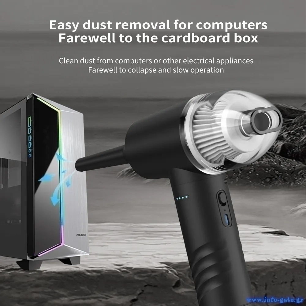 2 σε 1 σκουπάκι χειρός & air duster από την Kinzir. Είναι ιδανικό για γρήγορο και αποτελεσματικό καθάρισμα στο σπίτι ή το αυτοκίνητο αλλά και για την απομάκρυνση της σκόνης από αξεσουάρ και οικιακά αντικείμενα όπως πληκτρολόγια, PC cases, κλιματιστικά, ηλεκτρονικές συσκευές κ.α.
