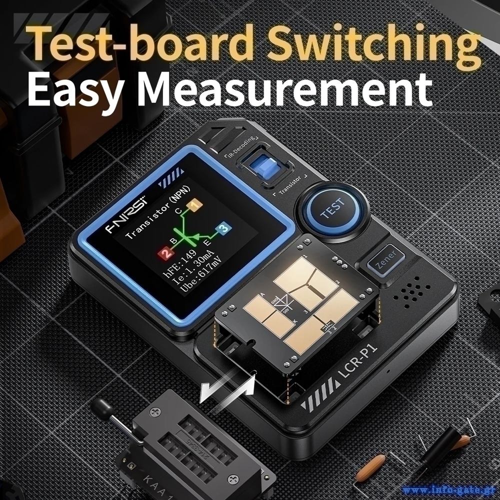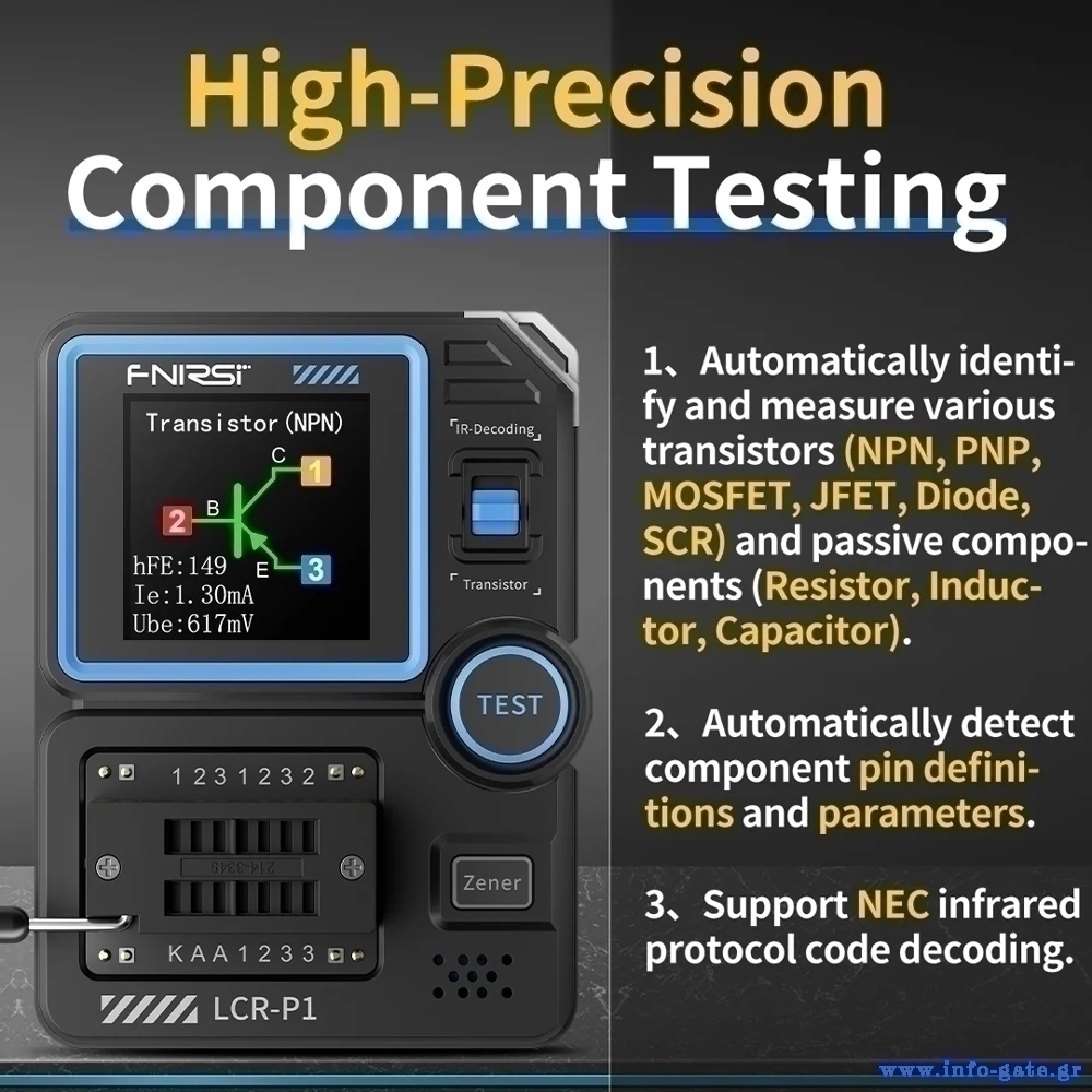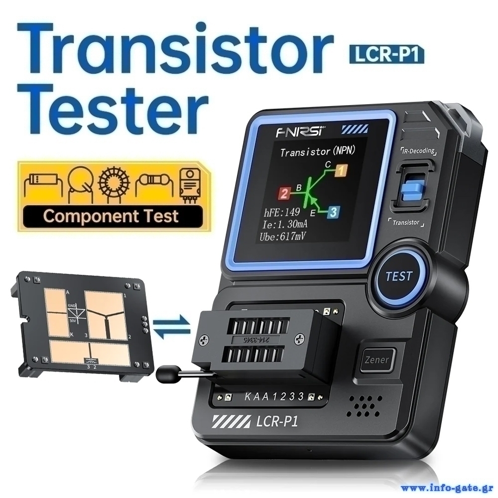 Το LCR-P1 είναι ένα transistor tester υψηλής ακρίβειας, πολλαπλών λειτουργιών. Αυτή η συσκευή επιτρέπει τον εντοπισμό και την ανάλυση της απόδοσης και των χαρακτηριστικών ημιαγωγών εξαρτημάτων όπως transistors, δίοδοι, triacs και field-effect transistors (FETs).