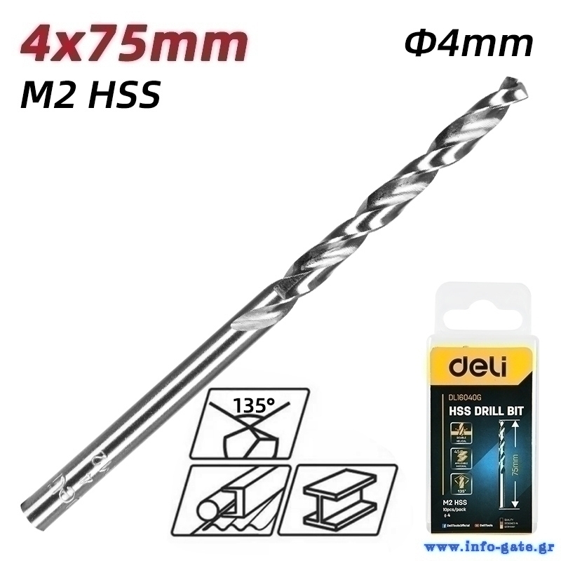 DELI σετ τρυπάνια DL16040G για μέταλλο, M2 HSS, 4x75mm, κυλινδρικό, 10τμχ