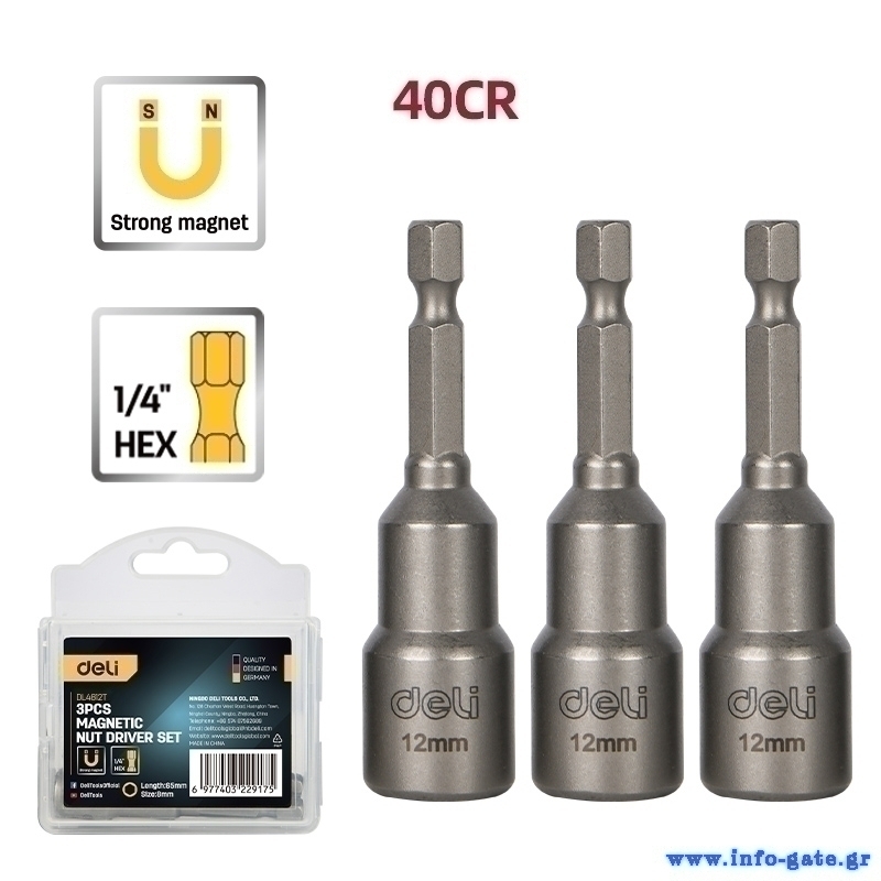 DELI σετ καρυδάκια DL4812T για δραπανοκατσάβιδο, μαγνητικά, 12mm, εξάγωνα, 3τμχ