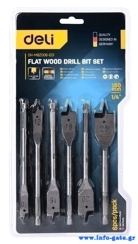 DELI σετ τρυπάνια φτερού DH-MBZ006-ED1 για ξύλο, χάλυβας άνθρακα, 10/12/16/18/20/25mm, εξάγωνο, 6τμχ