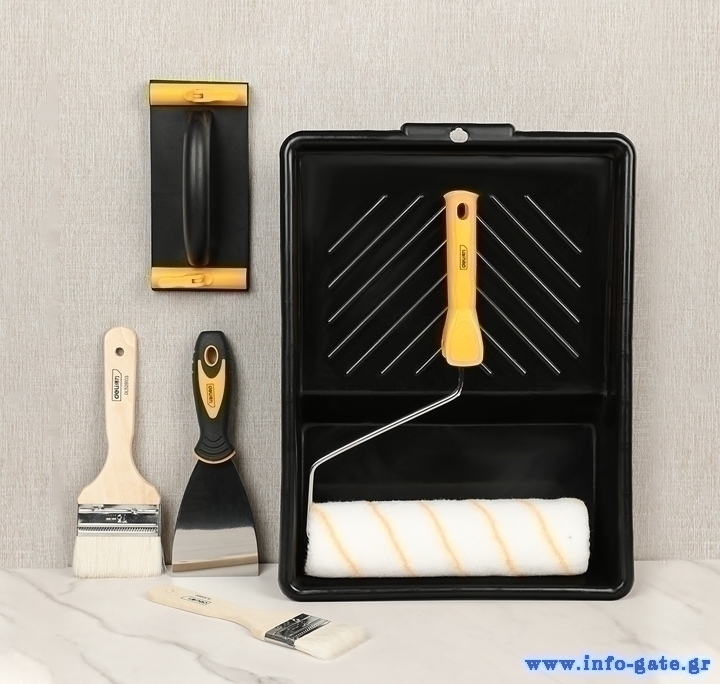 Σετ βαφής 6 σε 1 της Deli το οποίο αποτελείται από ρολό βαφής με λαβή, 2x πινέλα βαφής, σπάτουλα, γυαλοχαρτιέρα χειρός και σκάφη.