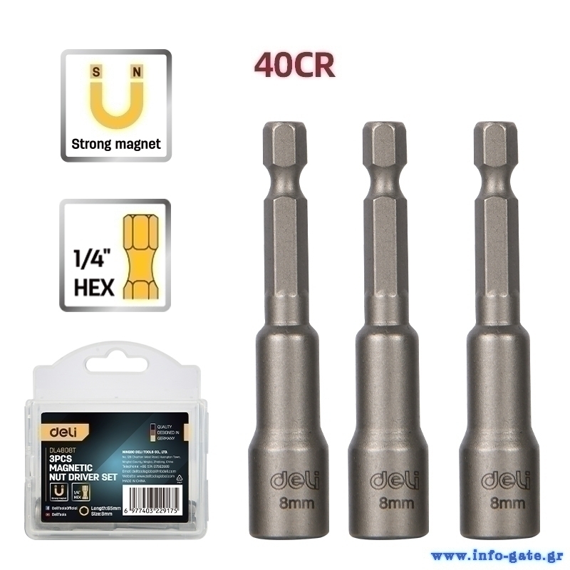 DELI σετ καρυδάκια DL4808T για δραπανοκατσάβιδο, μαγνητικά, 8mm, εξάγωνα, 3τμχ
