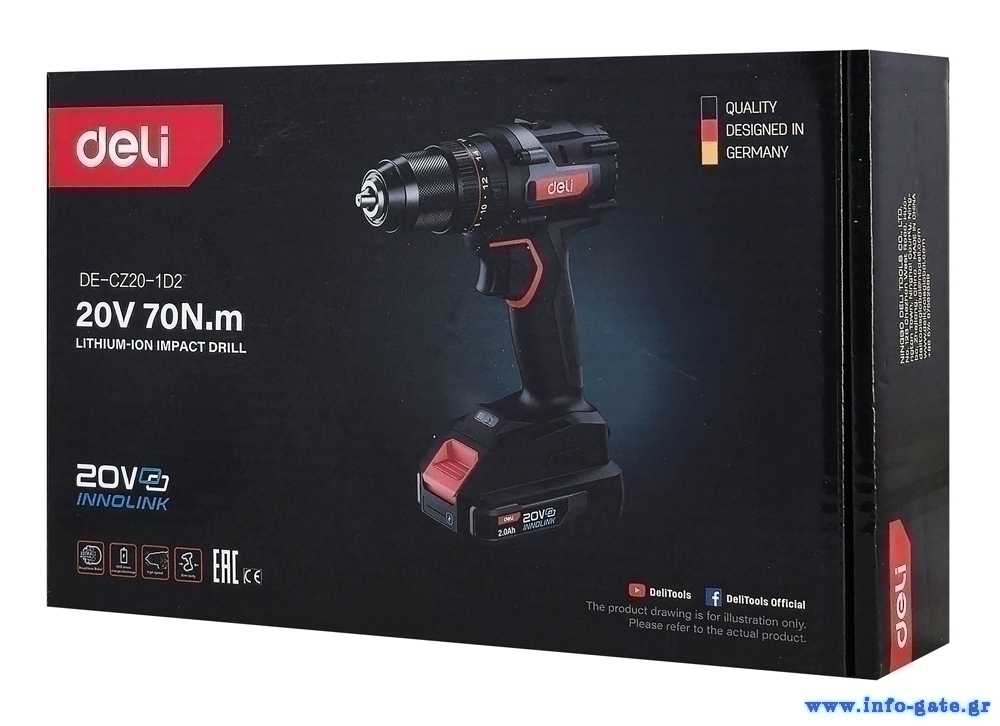 DELI κρουστικό δραπανοκατσάβιδο μπαταρίας DE-CZ20-1D2, Brushless, 20V, 2x 2Ah, 70N.m