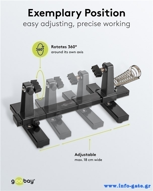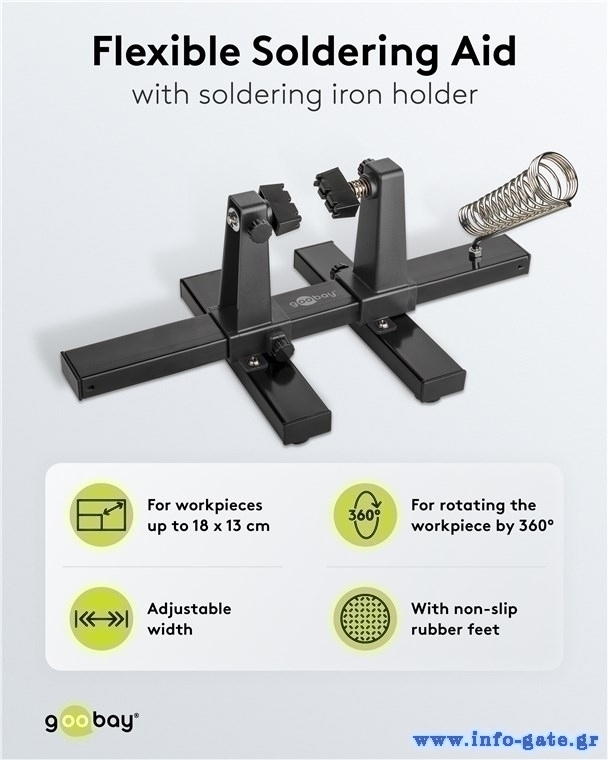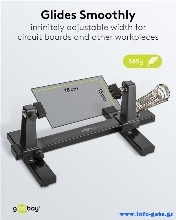Βάση της Goobay για την στερέωση ηλεκτρονικών εξαρτημάτων όπως πλακέτες, κατάλληλη για εργασίες συγκόλλησης. Η βάση της διαθέτει αντιολισθητικά pads, ενώ, οι πλαστικοί βραχίονες συγκράτησης είναι περιστρεφόμενοι, προσφέροντας μεγαλύτερη σταθερότητα και ευελιξία κατά την εργασία.