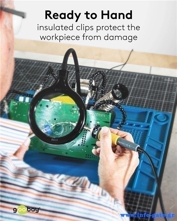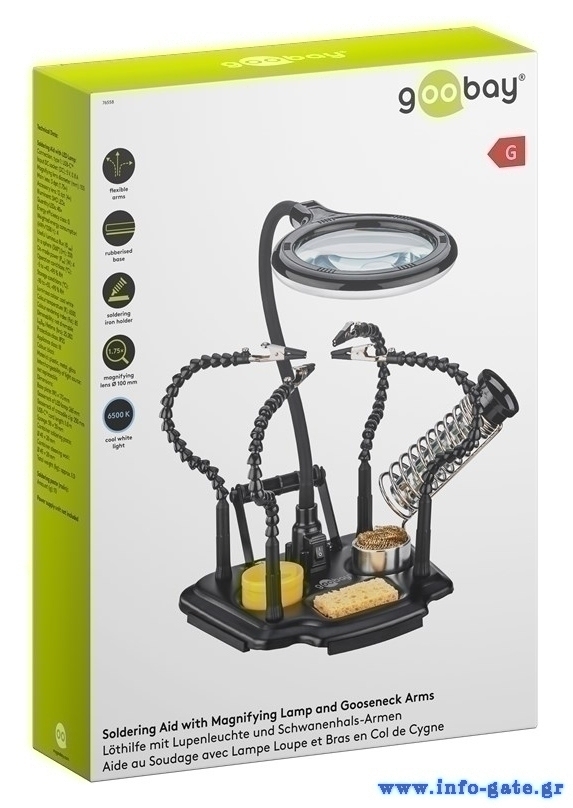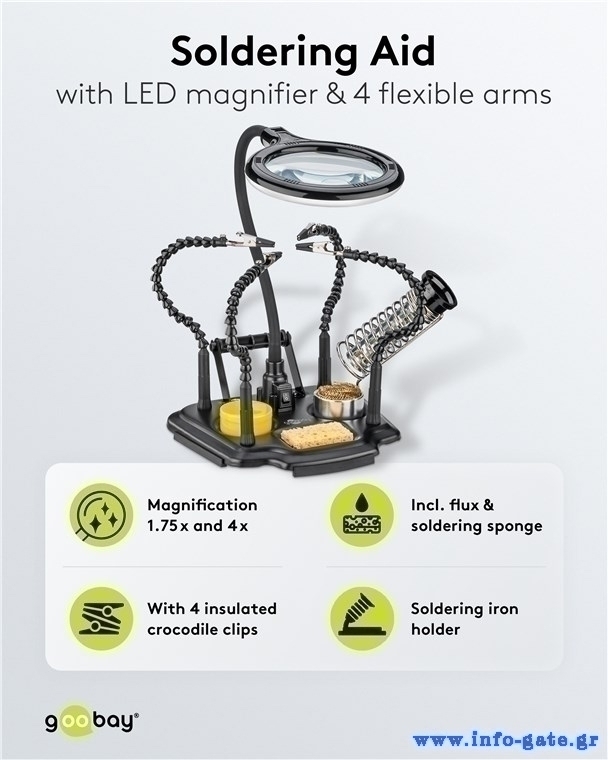 GOOBAY βάση στήριξης πλακέτας 76558 με μεγεθυντικό φακό & θέση για κολλητήρι, 4x βραχίονες, μαύρη