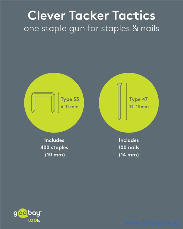 Είναι κατάλληλο για χρήση με καρφιά και συνδετήρες. Στη συσκευασία συμπεριλαμβάνονται 100x καρφιά και 400x συνδετήρες.