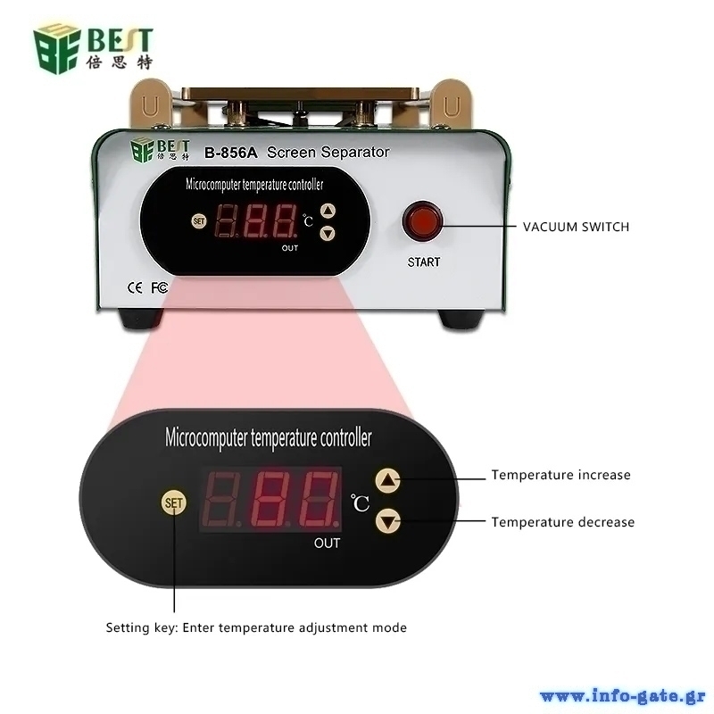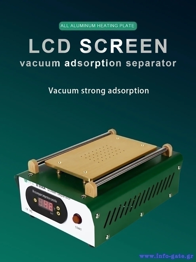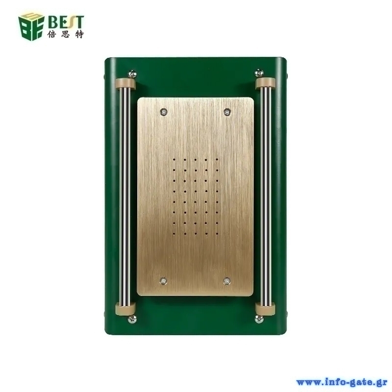 Μηχάνημα διαχωρισμού LCD οθόνης smartphone από την Best. Διαθέτει θερμοστάτη για την ρύθμιση της θερμοκρασίας και οθόνη για την παρακολούθηση της σε πραγματικό χρόνο. Υιοθετεί την τεχνική του κενού αέρα, μέσω της αντλίας που έχει, κάτι το οποίο κάνει πιο εύκολη την χρήση του καθότι δεν χρησιμοποιεί σφιγκτήρες για την σταθεροποίηση της οθόνης και την αφαίρεση της.