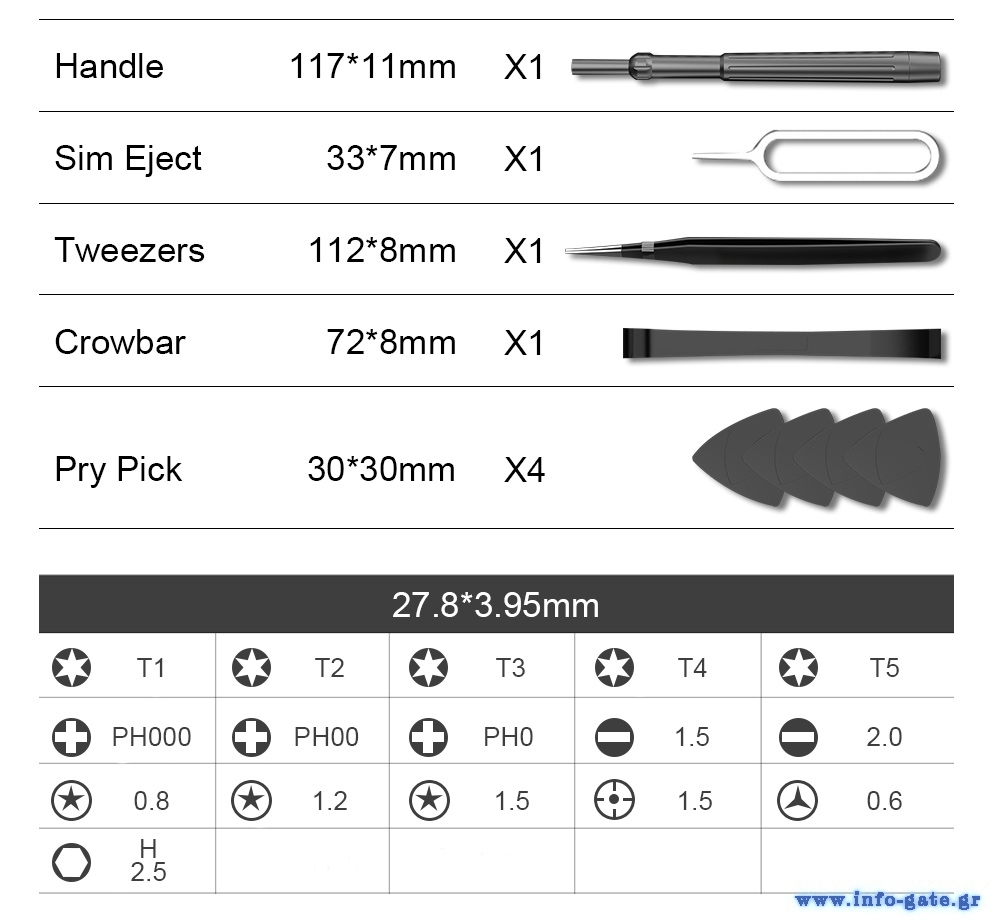 Σετ εργαλείων το οποίο αποτελείται από κατσαβίδια ακριβείας και άλλα χρήσιμα εργαλεία, όπως τσιμπίδα, pry pick, SIM needle και crowbar.