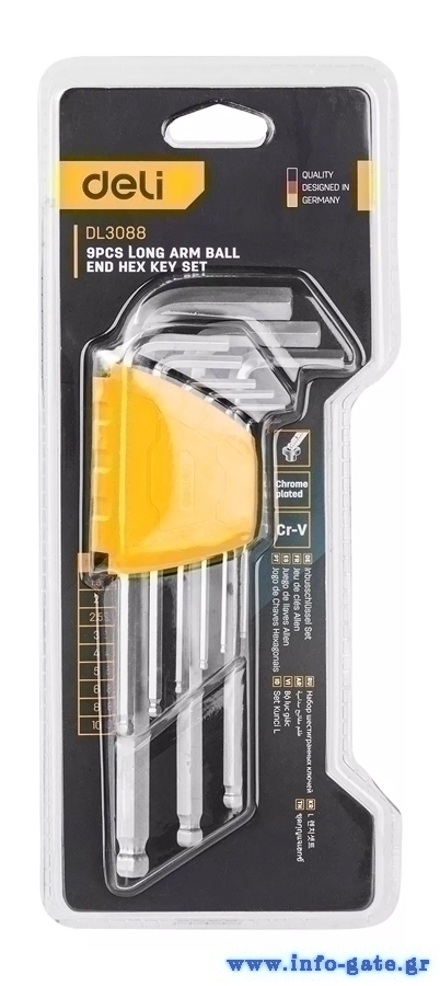 DELI σετ κλειδιά Allen DL3088 με μακρύ βραχίονα, 1.5-10mm, Cr-V, 9τμχ